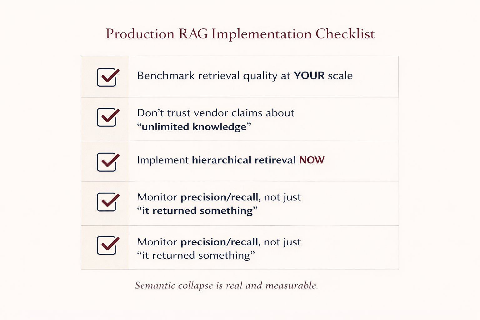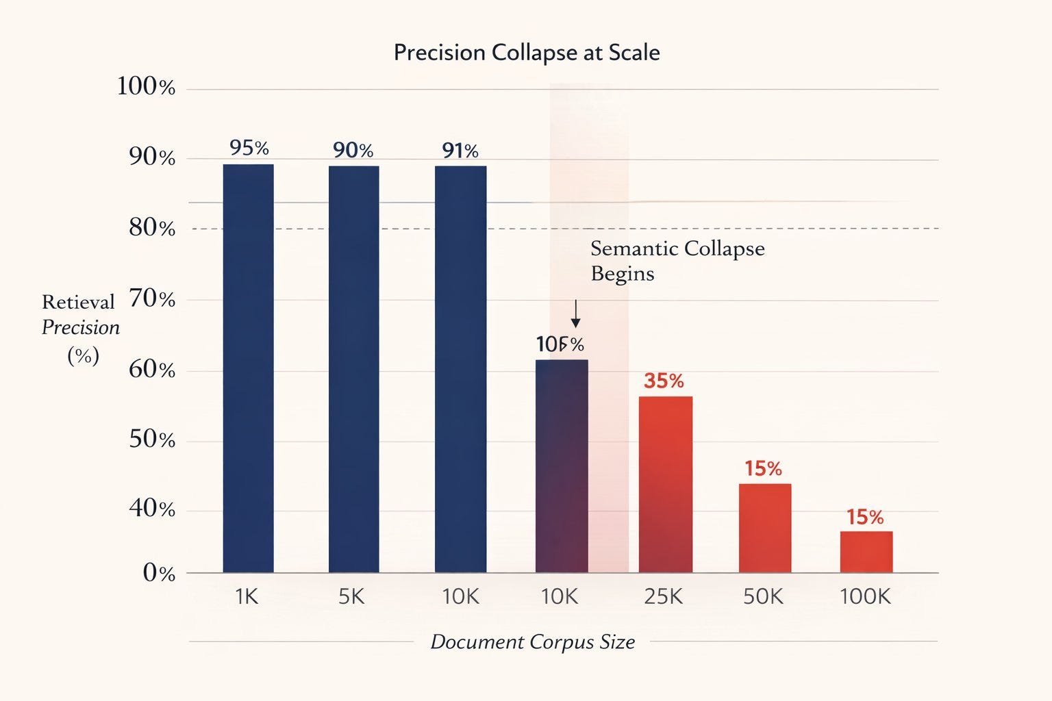 → 87% precision drop at 50k+ documents