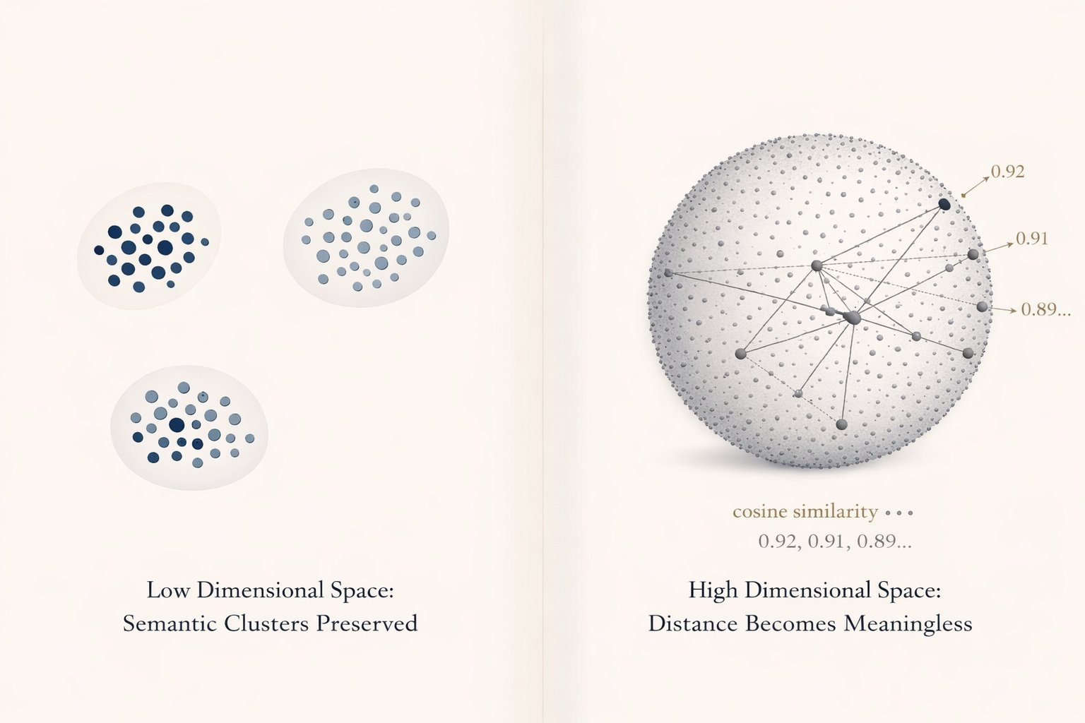 But add enough documents and the space fills up. Clusters overlap. Distances compress. Everything looks "relevant."