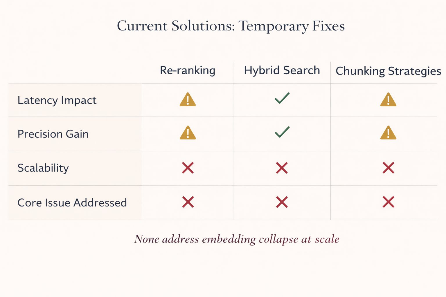 None address the core issue: embeddings don’t scale.