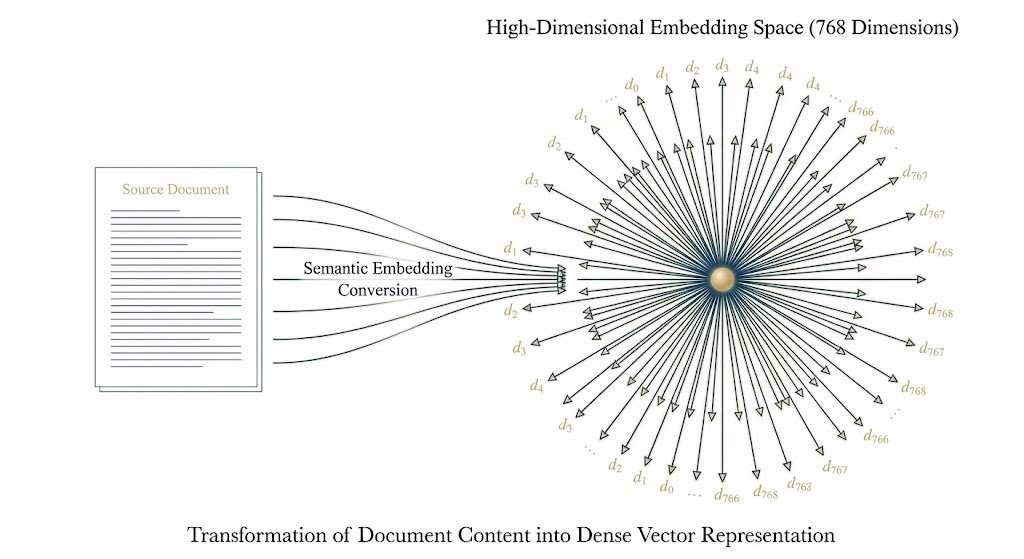 Every document you add to RAG gets converted to a high-dimensional embedding vector (typically 768-1536 dimensions).